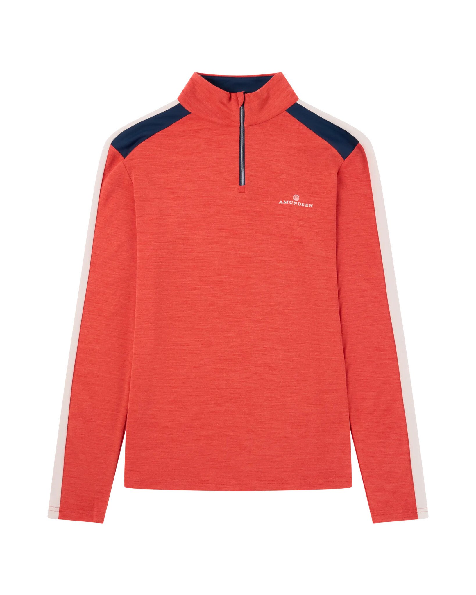 De Weathered Red/Stripe uitvoering brengt sportieve flair en heritage samen, met subtiele strepen en het herkenbare Amundsen-logo op de borst. Dankzij de halve rits kun je eenvoudig ventileren en blijft je comfortniveau altijd optimaal — van piste tot lodge.
